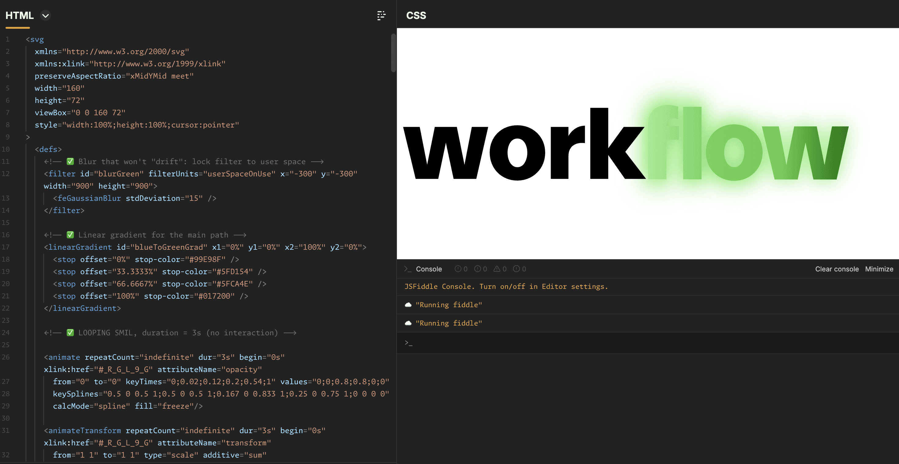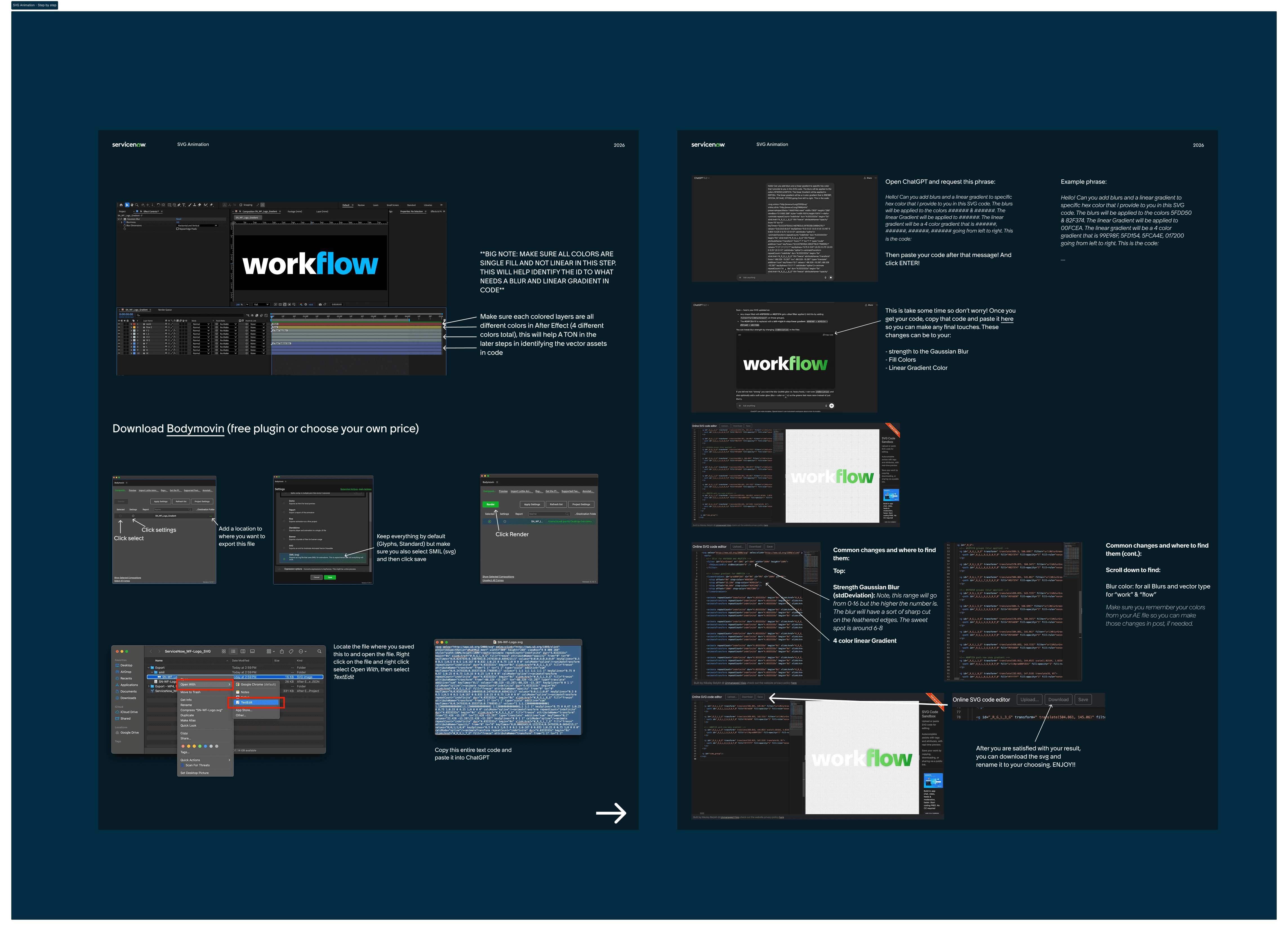 The animation was designed as a hover interaction for the ServiceNow logo on their Workflow webpage. The original motion design included glow effects; however, SVG animations do not support glow effects well. Because of this limitation, the glow treatment from the original animation could not be directly exported into SVG. Additionally, when exporting through Bodymovin as an SVG (SMIL), further complications appeared. The animation used both a linear gradient and Gaussian blur, which Bodymovin could not properly interpret or export.